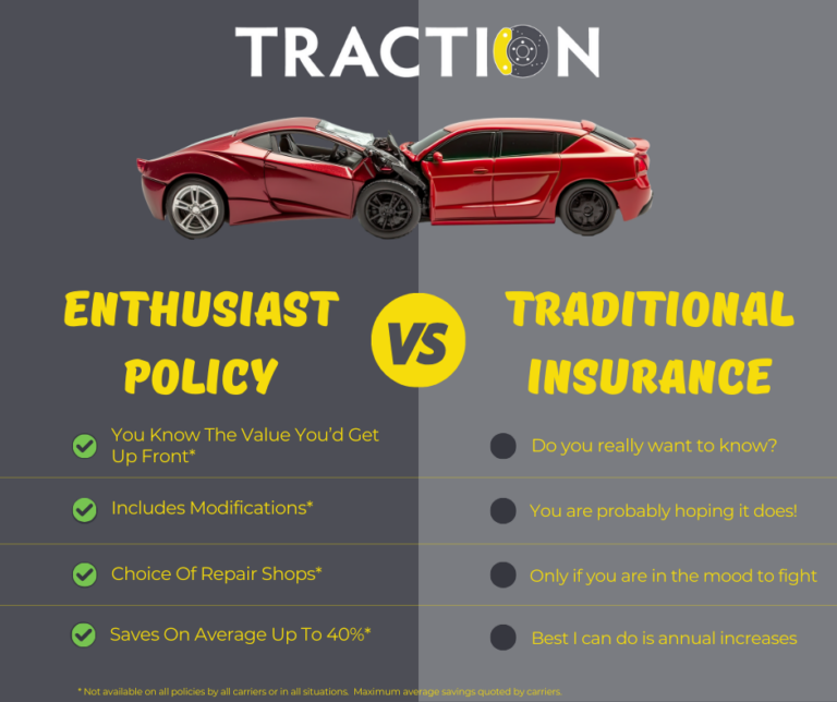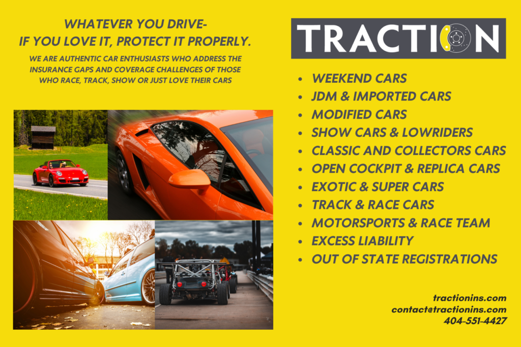 Traction is different because our team is different. Everyone at Traction either tracks, races, modifies, shows, and/or collects cars – just like you. That’s why you won’t need to explain your car, your hobby, or why you need the right coverage, because we do this for ourselves as well.