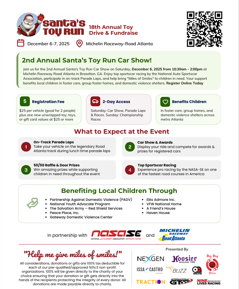 Traction is excited to return as a presenting sponsor for the 18th annual Santa’s Toy Run at Michelin Raceway Road Atlanta. This one of a kind toy drive and charity event includes a car show, NASA (National Auto Sport Association) Southeast Division HPDE and Time Trial races and more. Donations, raffle and car show all benefits select local charities that help foster care, group foster homes or domestic violence.